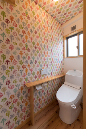 | 2階トイレ 天井と壁紙がつながっており、 見た目のインパクトがあります。 明るさとおしゃれな壁紙でトイレにいるとは思えません。 ※画像クリックで詳細表示されます。 |